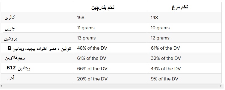 در این جدول مقادیر مواد مغذی انتخابی به ترتیب در 3.5 اونس (100 گرم) بلدرچین و تخم مرغ مقایسه شده است