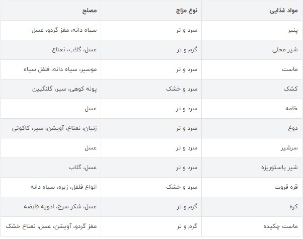 انواع لبنیات دارای طبیعتی خاص به خود میباشند. به عنوان نمونه طبیعت پنیر سرد و تر میباشد که بهتر است با مصلحش که سیاه دانه یا گردو میباشد استفاده شود، تا در طولانی مدت از عوارض ناخواسته مصرف آنها جلوگیری شود.