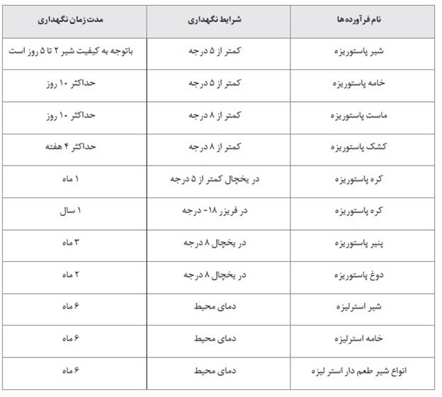 در جدول زیر می توانید نحوه نگهداری شیر و دیگر فراورده های لبنی همچنین مدت نگهداری با توجه به روش نگهداری را مطالعه کنید :